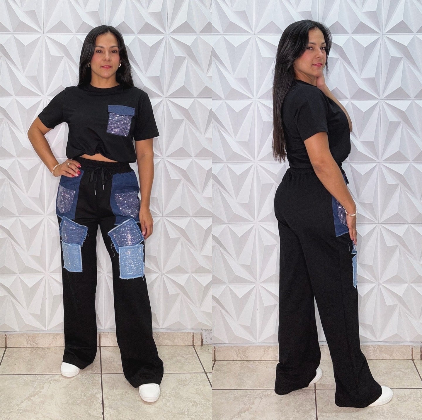 La tela es Stretch. Tiene detalles en Denim. El pantalón tiene elástico en la cintura. La blusita la puedes ajustar a tu gusto en la cintura. Corre al size. Usando talla Small. Modelo mide 5 1”