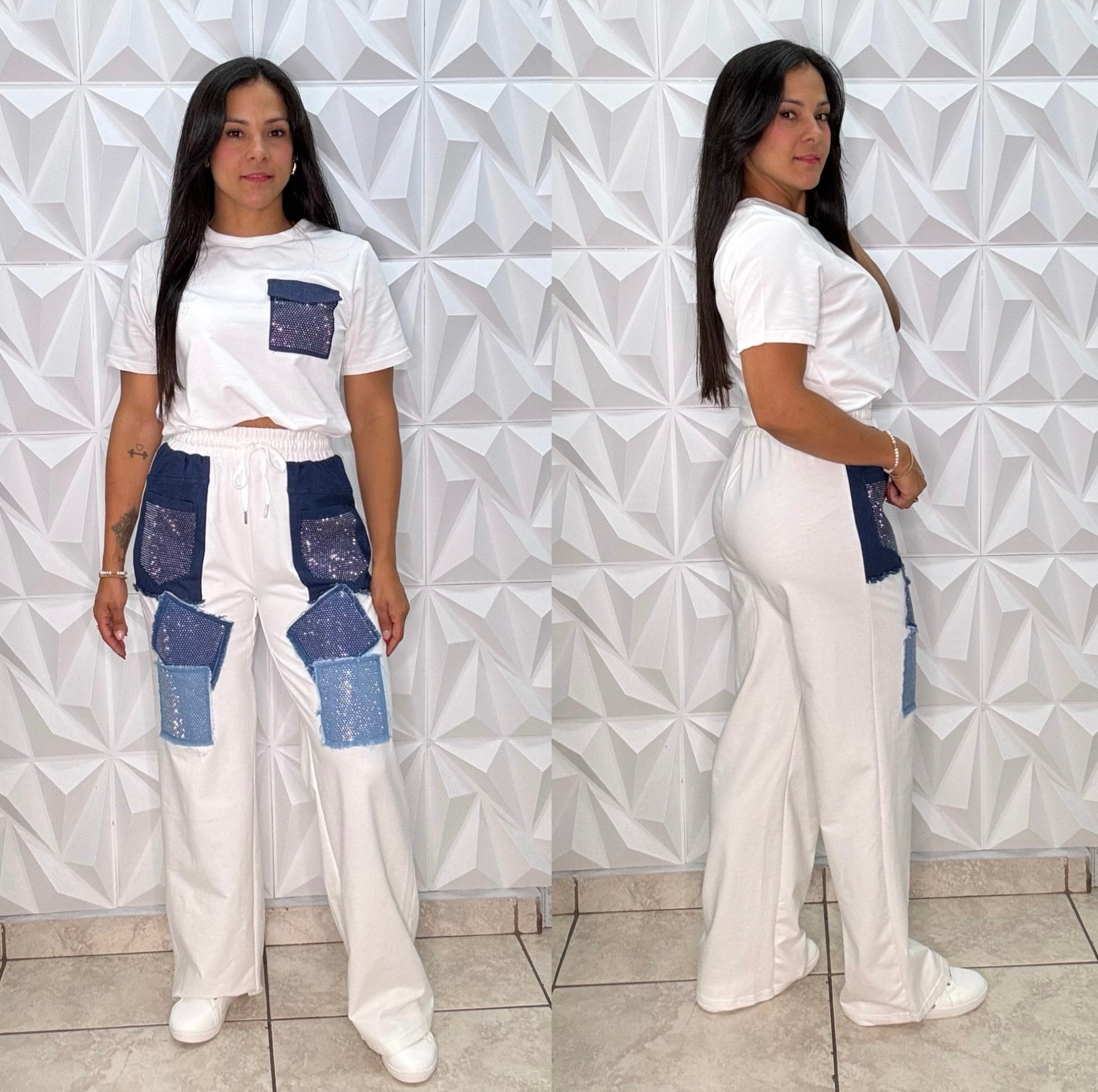 La tela es Stretch. Tiene detalles en Denim. El pantalón tiene elástico en la cintura. La blusita la puedes ajustar a tu gusto en la cintura. Corre al size. Usando talla Small. Modelo mide 5 1”