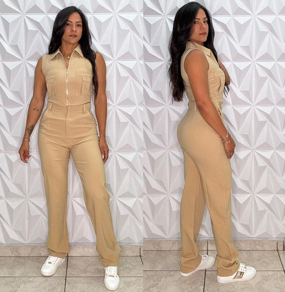 La tela es Poliéster, tiene un poquito de Stretch, calidad 20/10. No clarea. El Top es estilo vest, con zipper funcional. El pantalón tiene es high waist, con zipper y botón. Tiene bolsillos. Corre al size. Usando Small.