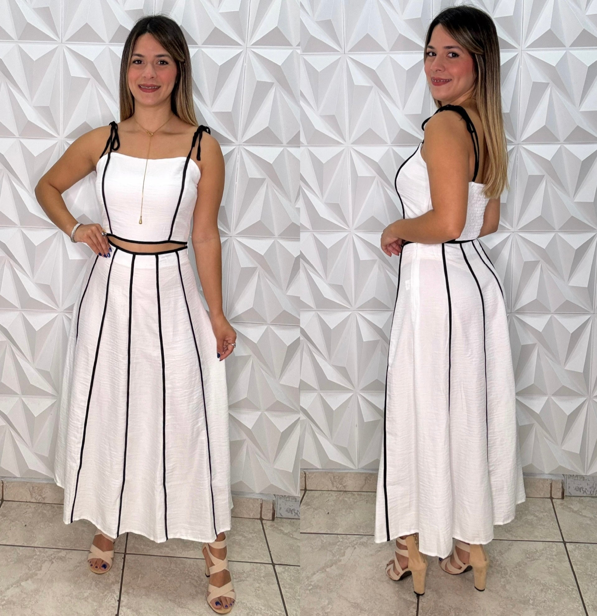 La tela tiene poco stretch. El top tiene elástico en la espalda. Manguillos ajustables y zipper lateral. Falda tiene zipper lateral. Corre al size. Usado talla Small. Modelo mide 5 1”