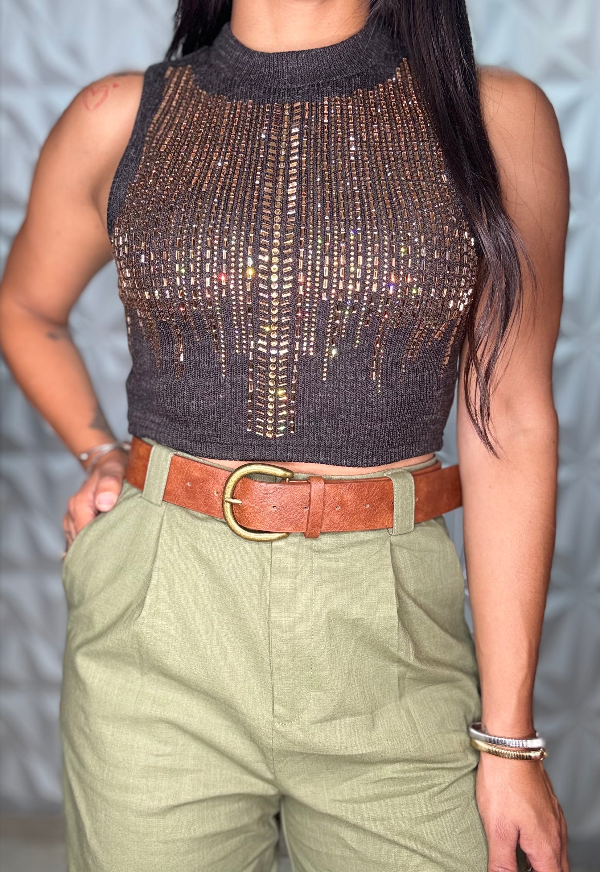 La tela es Stretch, tiene cuello alto. Color negro cenizo. Corre al size. Usada Small.