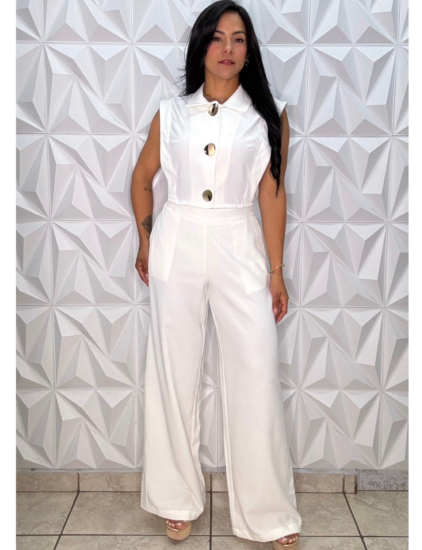 La tela tiene un poco de stretch, calidad 20/10. El top tiene botones funcionales en tono dorado. El pantalón es high waist, tiene elástico en la cintura, bolsillos y zipper. Corre al size. Modelo mide 5 1” y lo usa talla Small.
