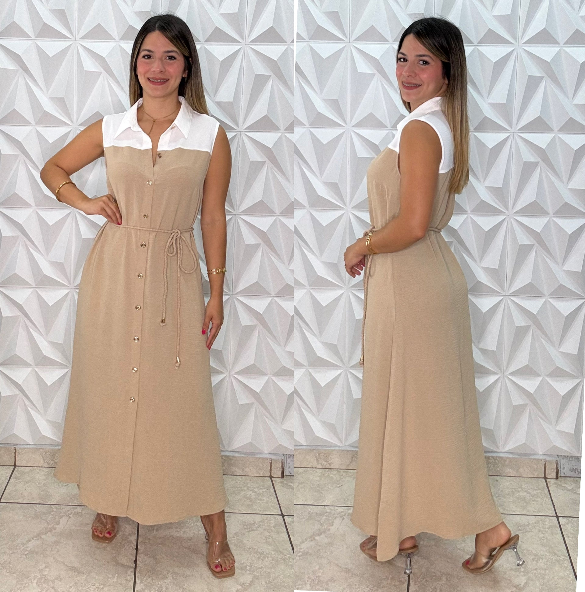 Tela es Poliéster, no estira. No clarea. Corre al size. Botones funcionales. Lo ajustas en la cintura a tu medida. Usado Small. Modelo mide 5 1”