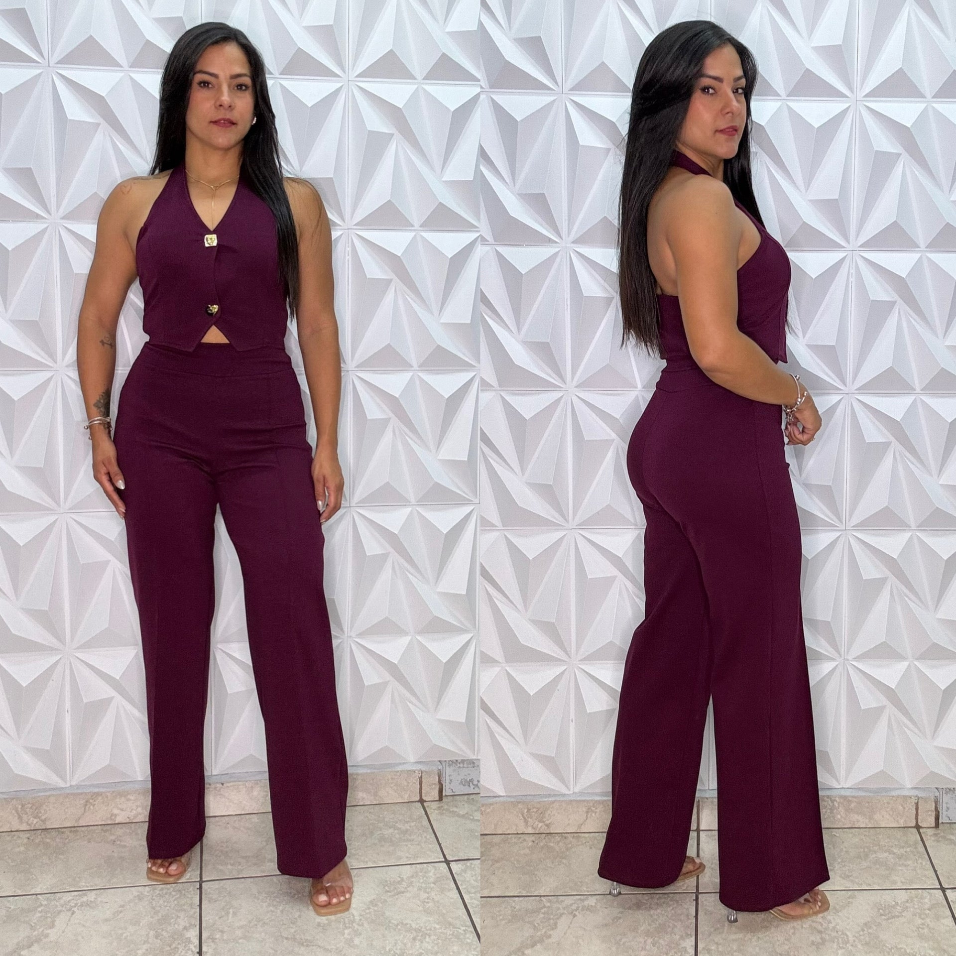 La tela es elástica, el pantalón es de talle alto. El top es estilo chaleco y tiene botones funcionales. Calza a la talla. Usando talla pequeña.