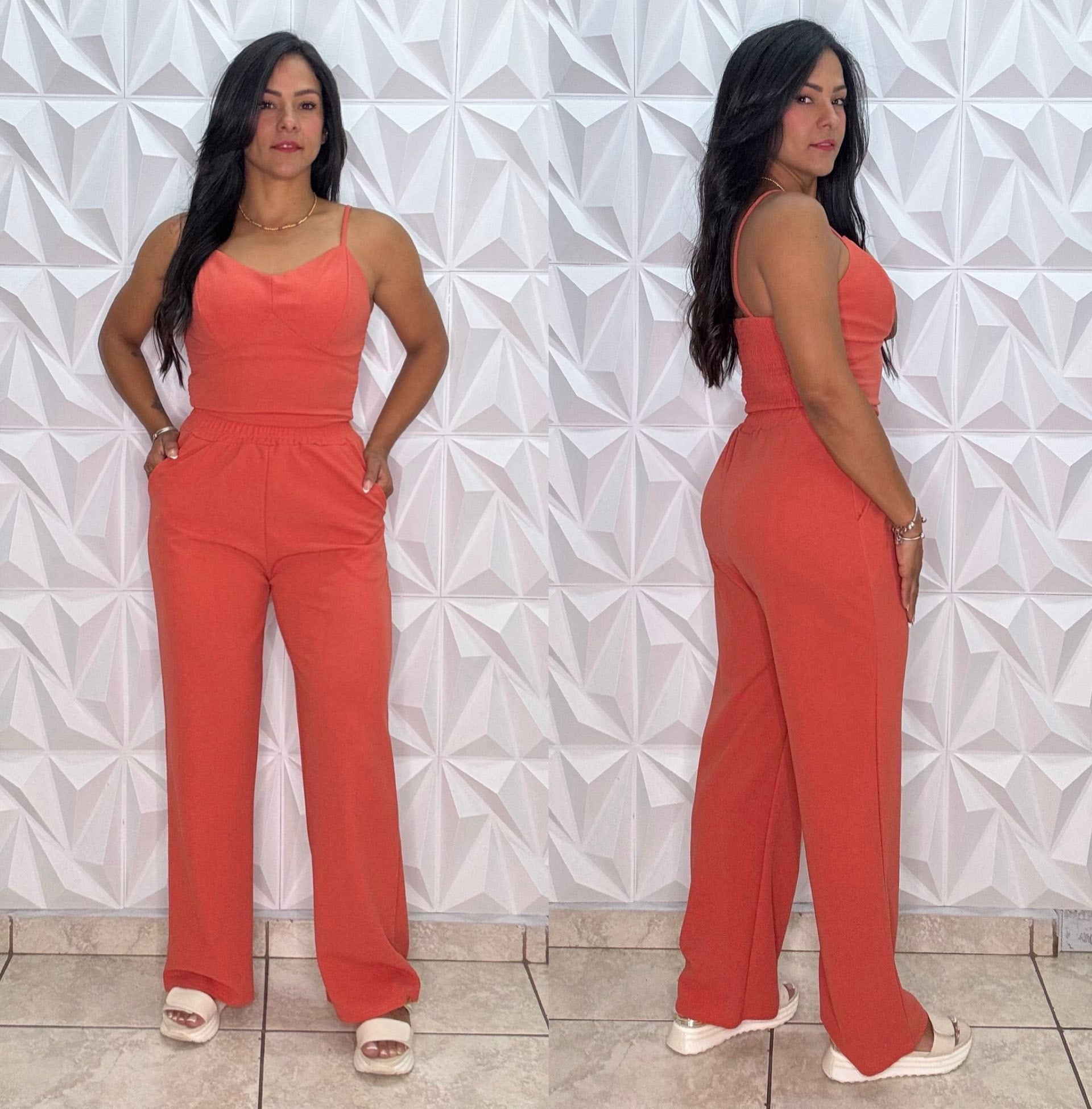 La tela es stretch, el top tiene elástico en la espalda. El pantalón es high waist y tiene bolsillos. Corre al size. Usando Small.