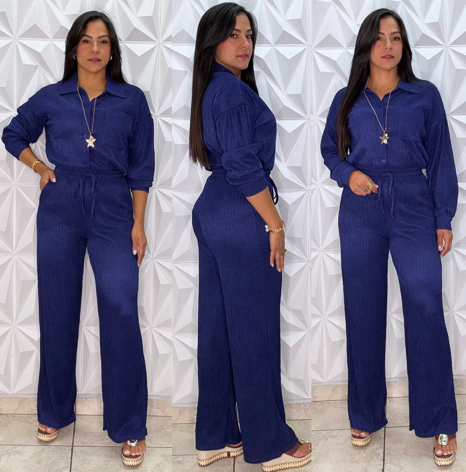 La tela es elástica. El top tiene botones funcionales, puedes usar la manga regular o 3/4. El palazzo tiene elástico en la cintura y bolsillos. Calza a la talla. Usando talla pequeña. La modelo mide 5'1".