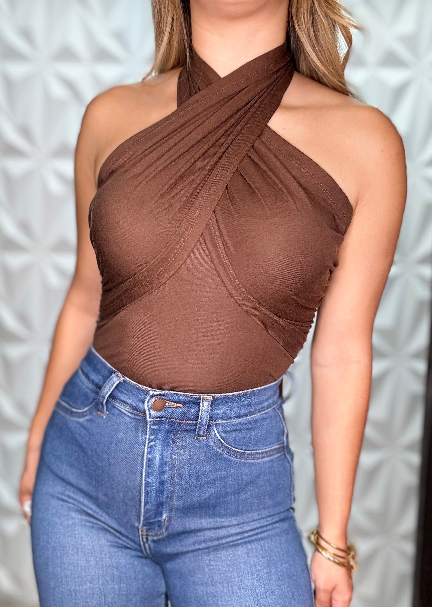 La tela es elástica, llega a la altura del ombligo. Se ata al cuello a tu gusto. Talla correcta. Usado talla pequeña.