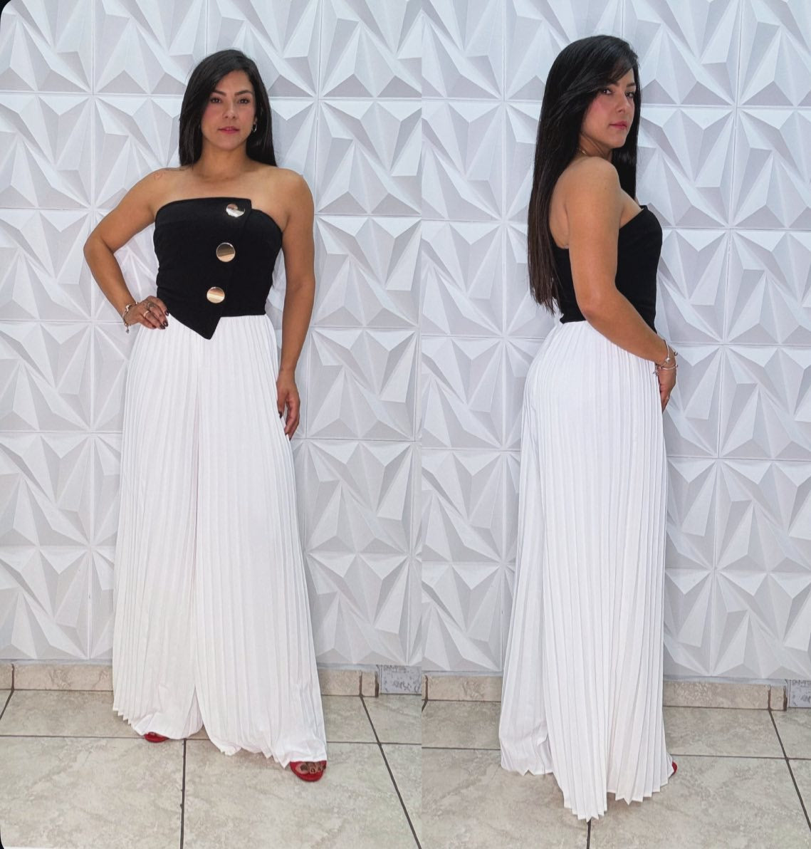 La tela estirada. Tiene cremallera en la espalda. Detalles de botones dorados. Usando talla Small. Modelo mide 5 1”. Tamaño corre al.