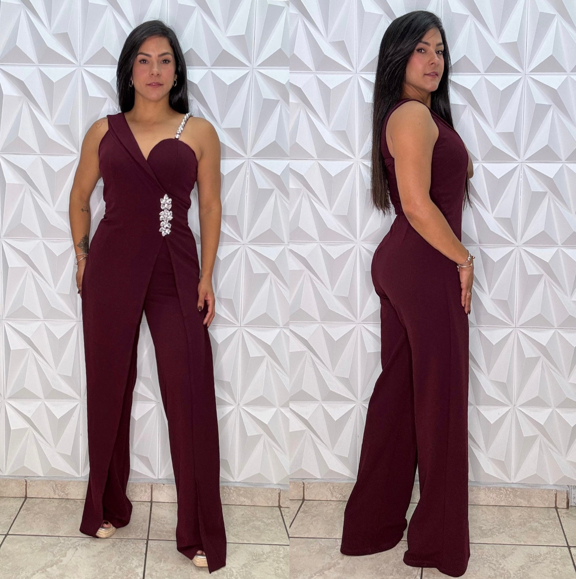 La tela es Stretch, tiene copas integradas. Detalles en pedrería en el manguillo y en la parte del frente. Cremallera en la espalda. Tamaño correal. Usado talla Small.